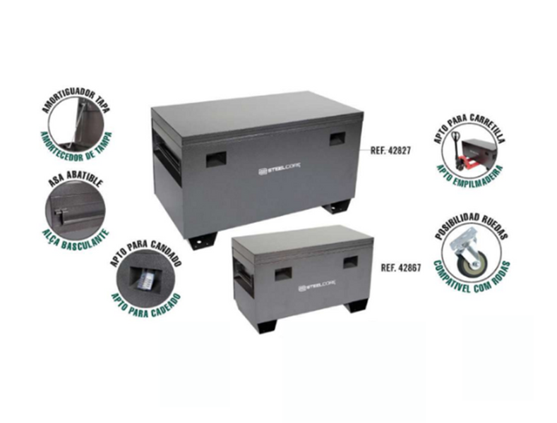 O modelo STEELCORE 42827 é um baú de alta resistência, desenvolvido para ambientes profissionais exigentes. Com estrutura em aço de 1,5 mm e base reforçada de 1,8 mm, garante segurança, capacidade e durabilidade.