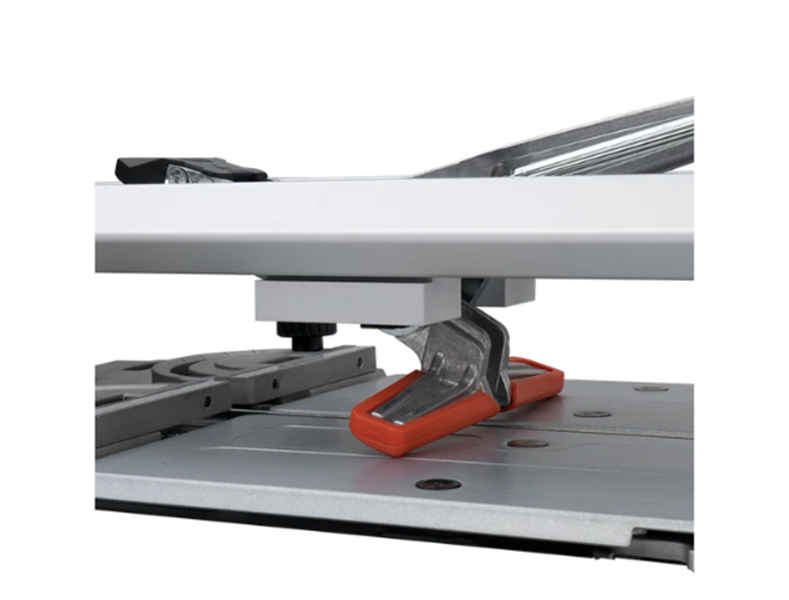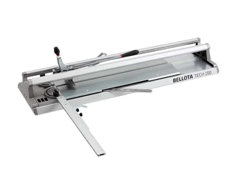 Cortador de cerâmica profissional de grande formato Tech patenteado, TECH100 (1.000 mm) - TECH125 (1.250 mm), espessura máxima de 20 mm, 1000 kg de força de separação, inclui esquadro, mala de transporte e rodel XL de 10 mm. Estrutura integrada, robusta, precisa e leve. Permite riscar a peça com apenas 2 kg de força. Para o ladrilhador profissional mais exigente.