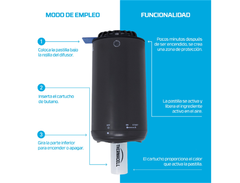 Este difusor é fácil de utilizar e muito eficaz. Inclui um dispositivo difusor, três pastilhas de celulose impregnadas de inseticida e um cartucho de butano.