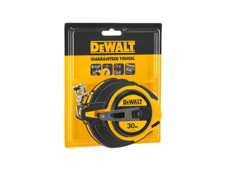 A Fita Métrica Longa de Aço de 30m DEWALT® apresenta um botão de libertação da lâmina e uma relação de engrenagens de 5-para-1 para recolhas rápidas da lâmina, aumentando a eficiência. O braço da manivela em aço inoxidável da fita longa proporciona durabilidade para locais de trabalho exigentes. Um anexo de mosquetão com mola oferece uma grande portabilidade.