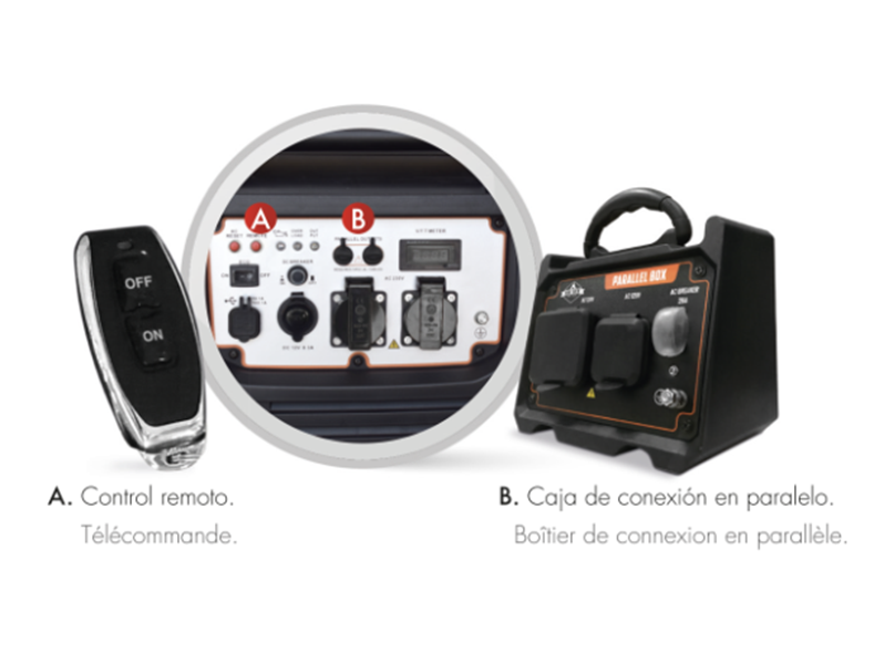 Está equipado com funções práticas como carregamento USB, sistema de arranque e paragem por controlo remoto (botão e comando), alarme de baixo nível de óleo, display digital com contador de horas e kit de transporte com rodas e pega dobrável, que facilita o seu deslocamento.