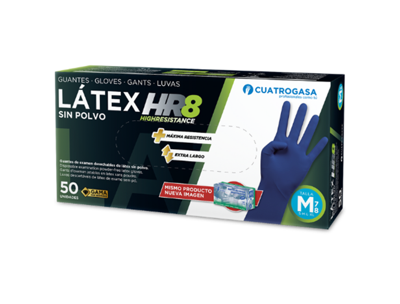 Luva de Exame em Látex de Alta Resistência (High Risk), sem pó, cor azul, descartável, marca Cuatrogasa.