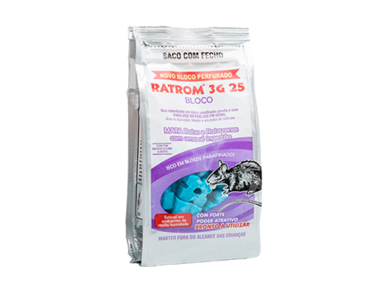 Raticida de dose única em bloco parafinado, com brodifacume. Ideal para zonas muito húmidas.
