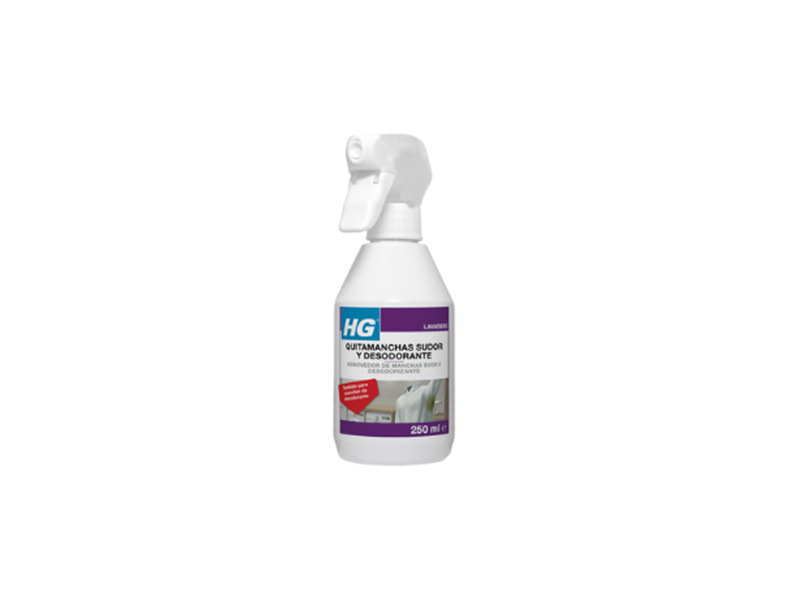 O HG Removedor de manchas suor e desodorizante é o pré-tratamento mais eficaz para a remoção desse tipo de manchas e é adequado para tecidos brancos e de cor. Ao usar este produto em cada lavagem também evita o aparecimento desse tipo de manchas.