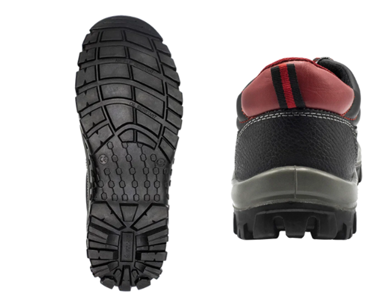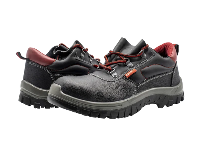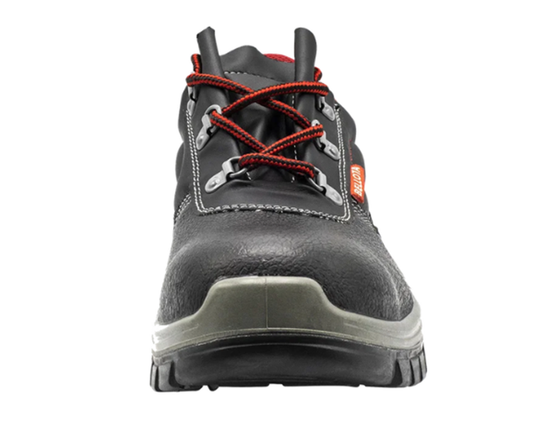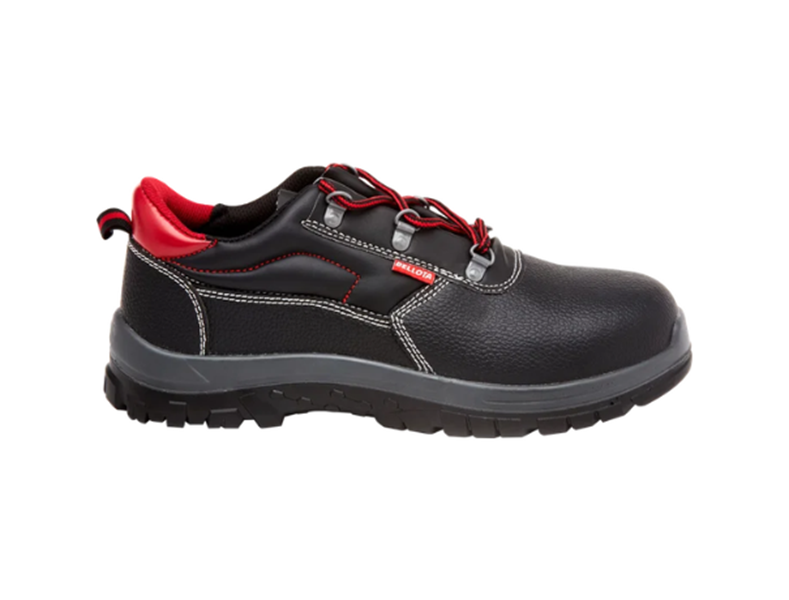 Sapato de segurança clássico S3, com palmilha anti-perfuração e biqueira de protecção metálica. Linguado com tratamento anti-hidrólise. Superior em couro preto repelente de água com detalhes em vermelho e cinzento. Confortável e robusto, para a construção e a indústria.