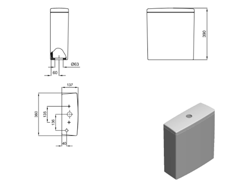 Feito em cerâmica, para instalação com sanita Pop Square BTW (encostada à parede). Entrada de água inferior, saída vertical. Dupla descarga (3/4,5 L).